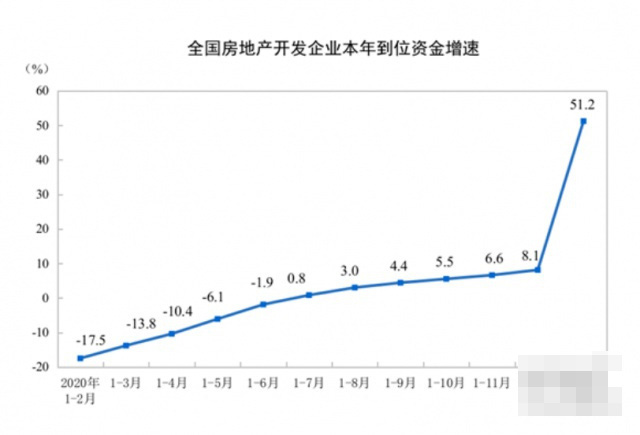 1—2月份,房地产开发企业到位资金30560亿元,同比增长51.2%;比2019年1—2月份增长24.7%,两年平均增长11.7%。其中,国内贷款5201亿元,增长14.4%;利用外资10亿元,下降14.0%;自筹资金8268亿元,增长34.2%;定金及预收款11002亿元,增长96.3%;个人按揭贷款4961亿元,增长63.7%。