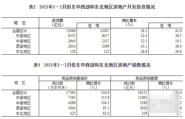 1—2月份,东部地区商品房销售面积7565万平方米,同比增长1.14倍;销售额11891亿元,增长1.48倍。中部地区商品房销售面积4369万平方米,增长1.04倍;销售额3280亿元,增长1.30倍。西部地区商品房销售面积5004万平方米,增长95.1%;销售额3620亿元,增长1.04倍。东北地区商品房销售面积425万平方米,增长82.0%;销售额359亿元,增长72.7%。