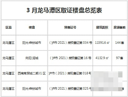 龙马潭区有3个楼盘取证4张,共入市新建商品住宅房源349套及车位97个。