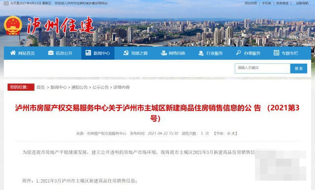 为促进泸州市房地产平稳健康发展,建立公开透明的房地产市场环境,2021年4月22日,泸州市房屋产权交易服务中心在泸州市住房和城乡建设局官方网站公布了“2021年3月泸州市主城区新建商品住房销售信息”和“2021年3月泸州市主城区新建商品住房在售项目销售排名情况”。