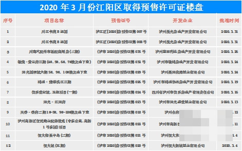 泸州市住房和城乡建设局公示显示,2020年3月份,泸州主城区共有14个楼盘获得商品房预售许可证,其中江阳区12个楼盘获得预售许可证;龙马潭区2个楼盘获得预售许可证。