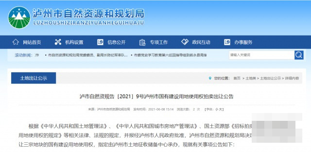 2021年6月8日,泸州市自然资源和规划局发布了泸市自然资规告[2021]9号泸州市国有建设用地使用权拍卖出让公告。