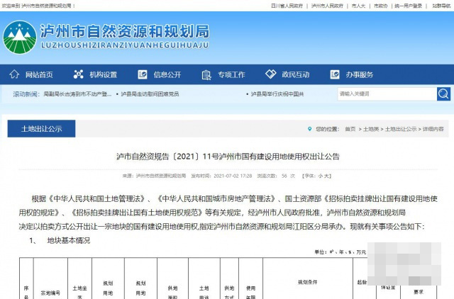 2021年7月2日,泸州市自然资源和规划局发布了泸市自然资规告〔2021〕11号泸州市国有建设用地使用权出让公告。