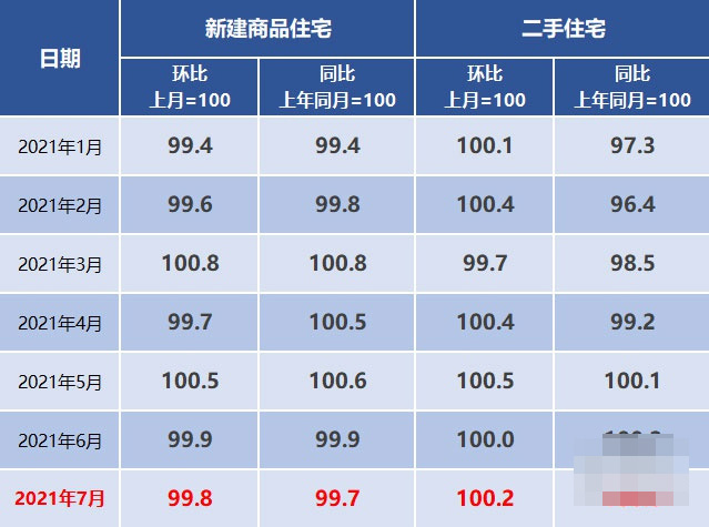 根据国家统计局最新数据显示,2021年7月份泸州新建商品住宅销售价格环比上月下降0.2%,同比上年同月下降0.3%。泸州二手住宅销售价格环比上月上涨0.2%,同比上年同月上涨0.6%。
