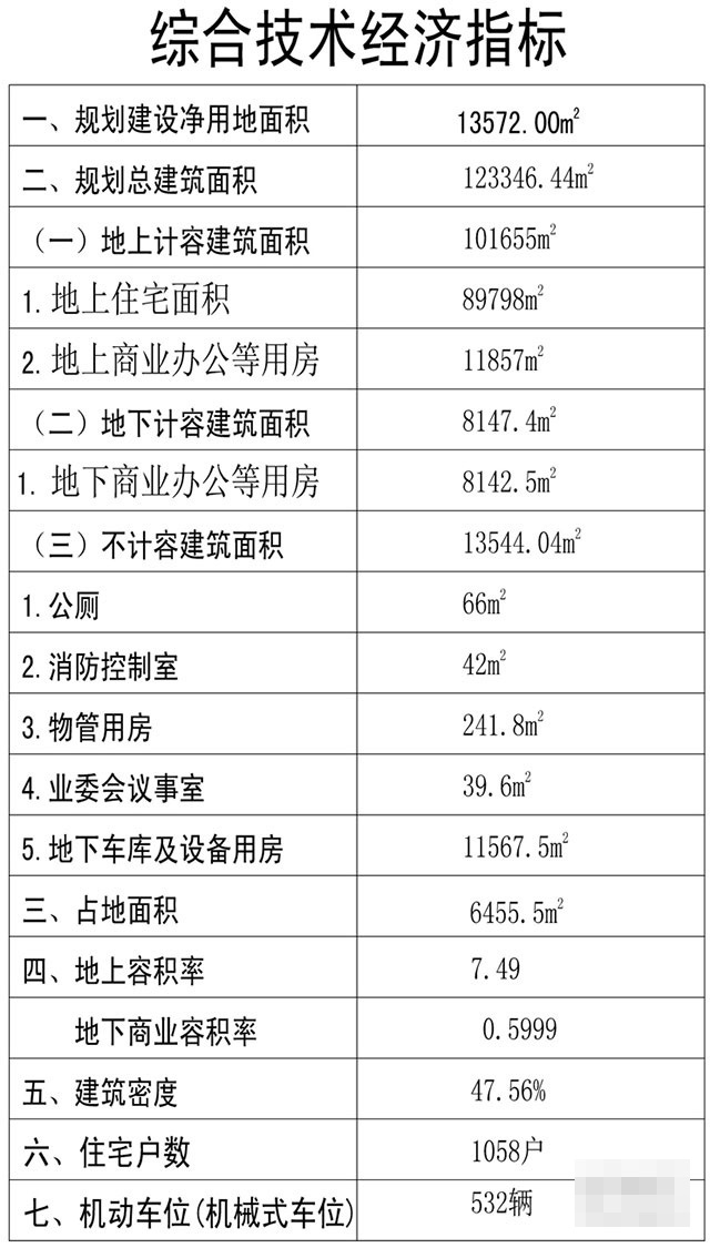 根据规划设计方案,项目地上容积率7.49,建筑密度47.56%,住宅户数1058户,机动车位532个。