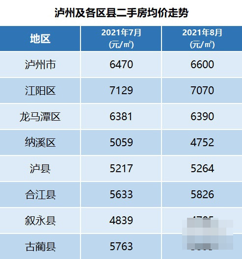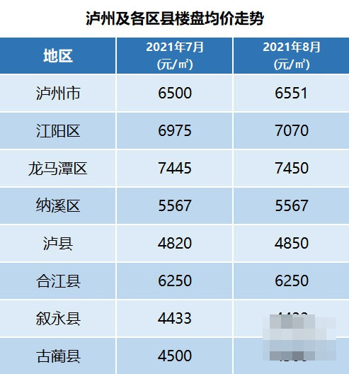 从数据可以看出,8月泸州及区县楼盘均价较上月变化不大,总体保持平稳。