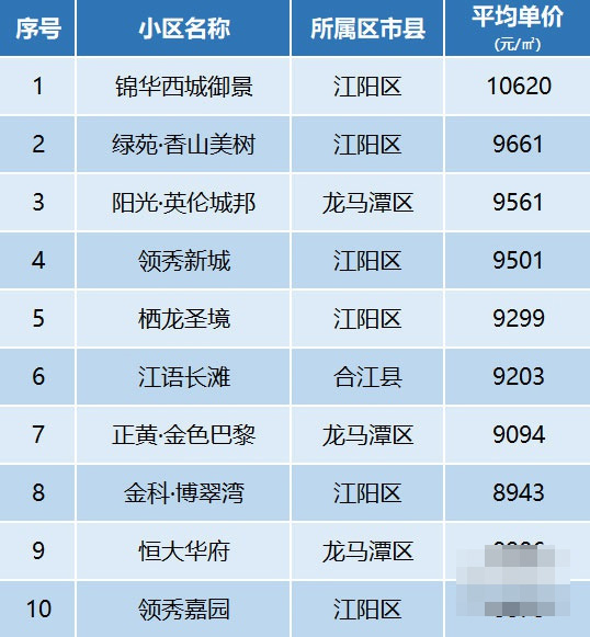 龙马潭均价7450元\㎡,较上月增长5元\㎡;