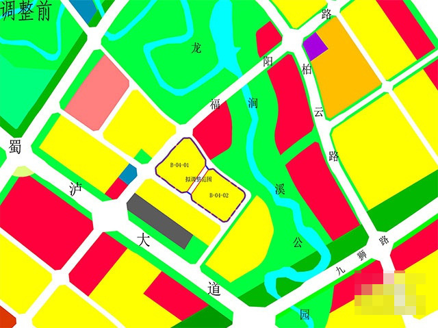 调整前,B-04-01地块面积2.16公顷,性质为居住用地,容积率≤2.0,建筑密度≤25%,建筑高度≤36米,绿地率≥35%;B-04-02地块面积2.09公顷,性质为居住用地,容积率≤2.0,建筑密度≤25%,建筑高度≤36米,绿地率≥35%。两个地块之间规划有18米宽道路,占地约0.29公顷。