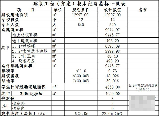 根据规划设计方案显示,项目容积率0.73,建筑密度18.02%,绿地率30.01%,运动场面积4050㎡。