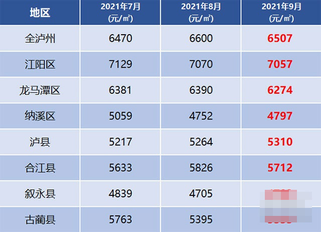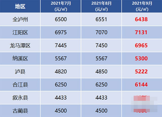 从全泸州整体来看,楼盘均价较上月下跌113元/平方米,其中,江阳区较上月增长61元/平方米;龙马潭区较上月下跌485元/平方米;纳溪区较上月下跌267元/平方米;泸县较上月增长372元/平方米;合江县较上月下跌106元/平方米;叙永县较上月增长205元/平方米;古蔺县较上月增长150元/平方米;