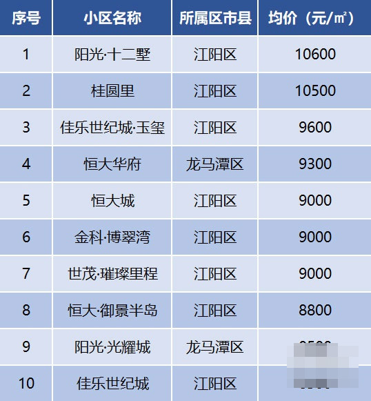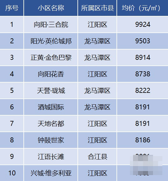 同时全国房价行情网还列出了2021年9月泸州均价前十的小区。