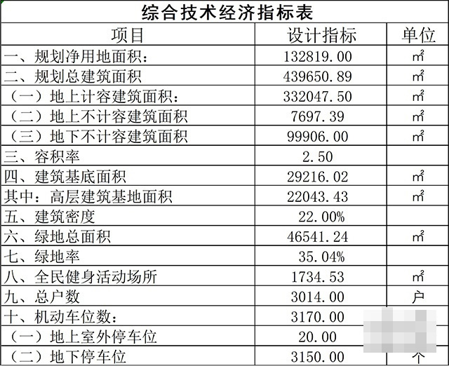 根据项目规划方案显示,项目的容积率2.5,建筑密度22%,绿地率35%,总户数3014户,机动车位3170个。
