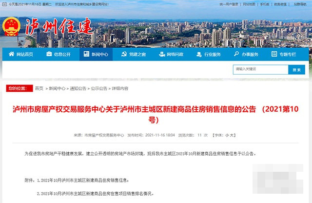 为促进房地产平稳健康发展,建立公开透明的房地产市场环境,2021年11月16日泸州市房屋产权交易服务中心发布了2021年10月泸州市主城区新建商品住房销售信息的公告。