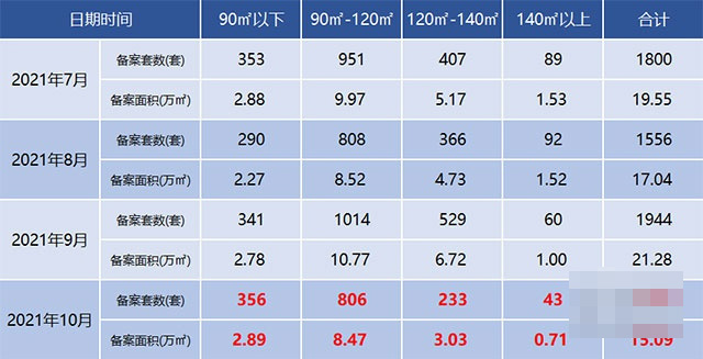根据公告显示,2021年10月泸州市主城区新建商品住房备案套数合计为1438套,备案面积合计为15.09万㎡。其中,小于90㎡的户型备案356套,面积2.89万㎡;90㎡-120㎡的户型备案806套,面积8.47万㎡;120㎡-140㎡的户型备案233套,面积3.03万㎡;大于140㎡的户型备案43套,面积0.71万㎡。以下是泸房汇根据泸州市房屋产权交易服务中心发布的数据,整理出的2021年7月至10月泸州市主城区新建商品住房销售信息,仅供参考!