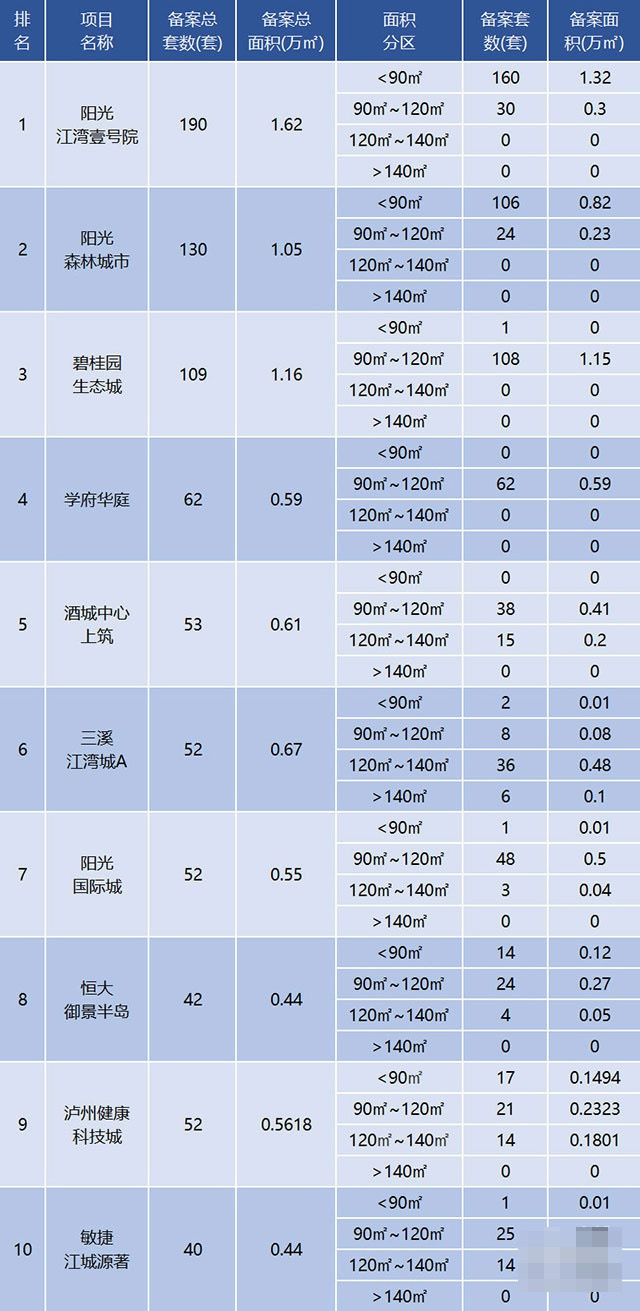 同时,公告还列出了2021年10月泸州市主城区新建商品住房销售前10的楼盘,前3名分别是阳光江湾壹号院、阳光森林城市、碧桂园生态城。来看看哪10个楼盘在10月份卖的好。