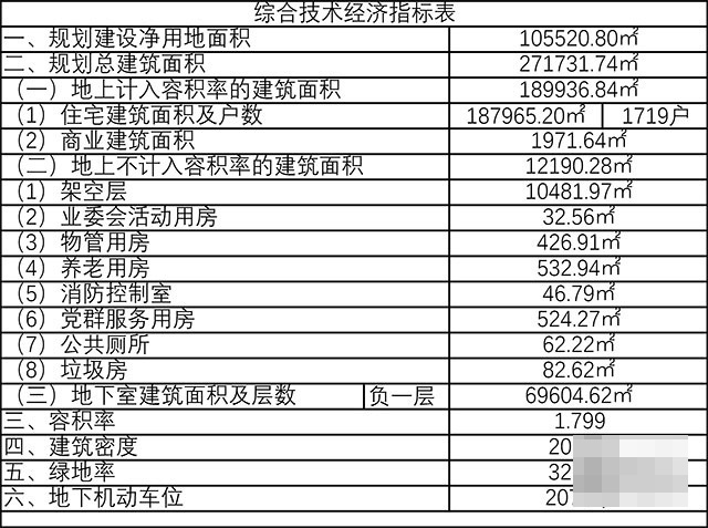 根据项目规划方案显示,项目容积率1.799,建筑密度20.67%,绿地率32.5%,住宅建筑户数1719户,地下机动车位2077个。