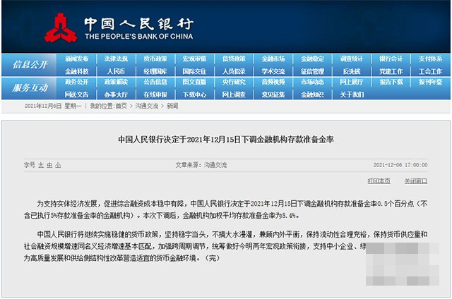 据中国人民银行消息,为支持实体经济发展,促进综合融资成本稳中有降,中国人民银行决定于2021年12月15日下调金融机构存款准备金率0.5个百分点(不含已执行5%存款准备金率的金融机构)。本次下调后,金融机构加权平均存款准备金率为8.4%。