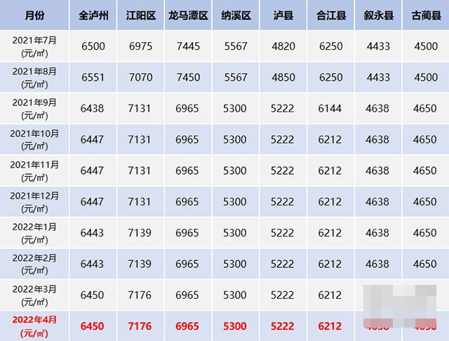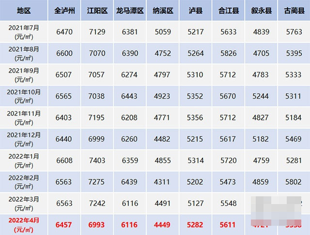 从全国房价行情网公布的数据可以看到,2022年4月全泸州和各区县的楼盘均价较上月保持平稳,泸州房地产市场保持总体平稳态势。