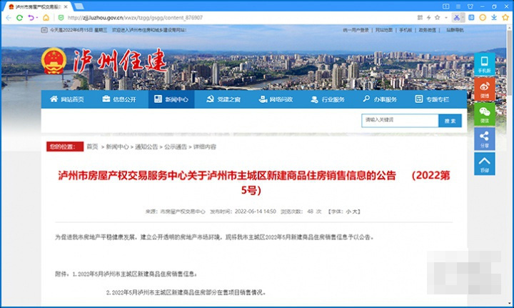 为促进房地产平稳健康发展,建立公开透明的房地产市场环境,2022年6月14日泸州市房屋产权交易服务中心关于泸州市主城区新建商品住房销售信息的公告(2022第5号)。