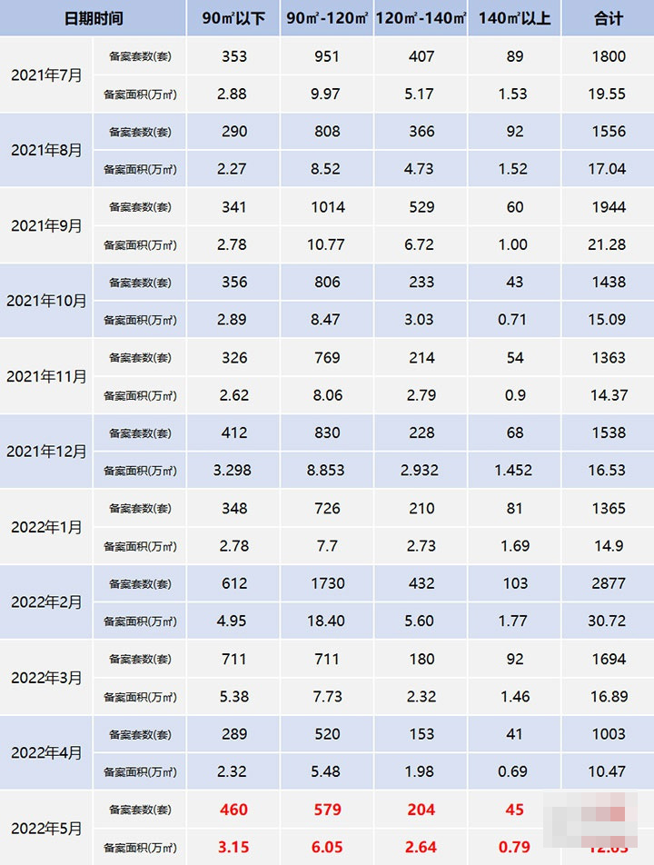 根据公告显示,2022年5月泸州市主城区新建商品住房备案套数合计为1288套,备案面积合计为12.63万㎡。其中,小于90㎡的户型备案460套,面积3.15万㎡;90㎡-120㎡的户型备案579套,面积6.05万㎡;120㎡-140㎡的户型备案204套,面积2.64万㎡;大于140㎡的户型备案45套,面积0.79万㎡。以下是泸房汇根据泸州市房屋产权交易服务中心发布的数据,整理出的2021年7月至2022年5月泸州市主城区新建商品住房销售信息,仅供参考!