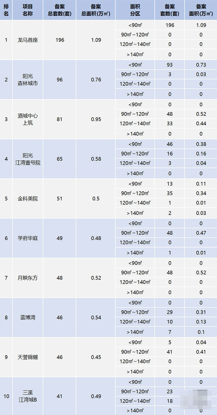 同时,公告还列出了2022年5月泸州市主城区新建商品住房销售前10的项目,前3名分别是龙马首座、阳光森林城市、酒城中心上筑。来看看哪10个楼盘在5月份卖的好。