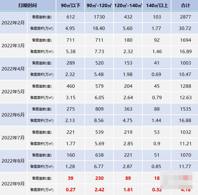 根据公告显示,2022年9月泸州市主城区新建商品住房备案套数合计为376套,备案面积合计为4.18万㎡。其中,小于90㎡的户型备案39套,面积0.27万㎡;90㎡-120㎡的户型备案230套,面积2.42万㎡;120㎡-140㎡的户型备案89套,面积1.61万㎡;大于140㎡的户型备案18套,面积0.32万㎡。以下是泸房汇根据泸州市房屋产权交易服务中心发布的数据,整理出的2022年2月至2022年9月泸州市主城区新建商品住房销售信息,仅供参考!