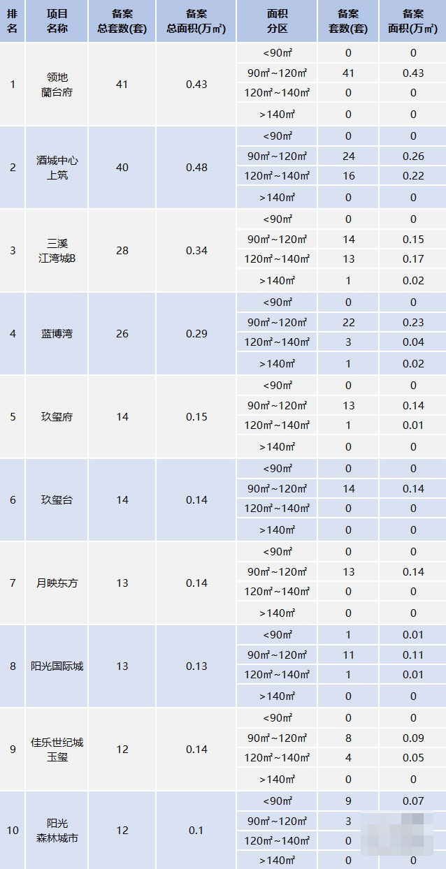 同时,公告还列出了2022年9月泸州市主城区新建商品住房销售前10的项目,前3名分别是领地蘭台府、酒城中心上筑、三溪江湾城B。来看看哪10个楼盘卖的好。