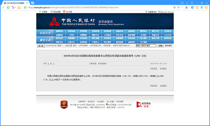 2023年4月20日,中国人民银行授权全国银行间同业拆借中心公布,2023年4月20日贷款市场报价利率(LPR)为:1年期LPR为3.65%,5年期以上LPR为4.3%。以上LPR在下一次发布LPR之前有效。