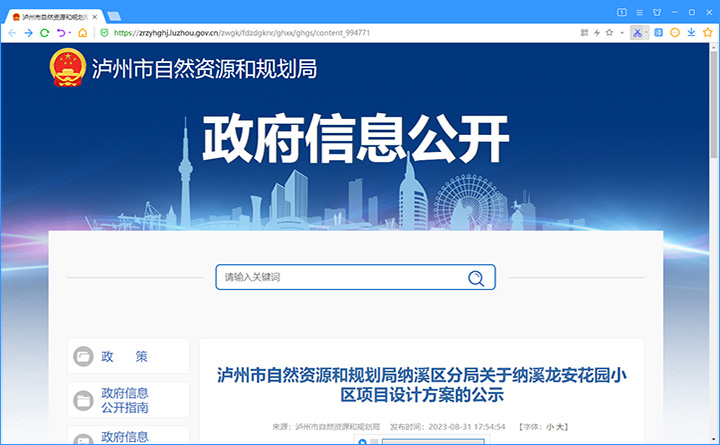 2023年8月31日,泸州市自然资源和规划局纳溪区分局发布了关于纳溪龙安花园小区项目设计方案的公示。