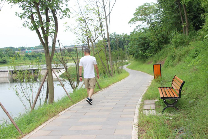 7月30日,正值盛夏时节,玉带河公园(海绵项目)沿湖生态绿廊绿草茵茵,碧波微澜,虫鸣鸟叫,风景怡人。一大早,家住龙马潭区恒大·华府小区居民张宇强就来到公园里,沿着改造后的宽敞步道跑步,享受早晨的清凉。