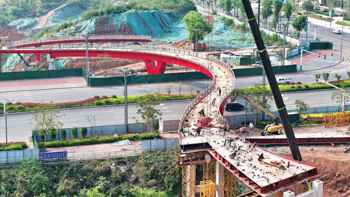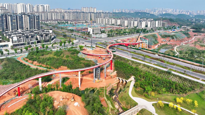 空中景观桥全长800米,呈“S”形,将通过近70个桥墩横跨云峰路,连接公园两侧地块,建成后将成为公园内的特色地标之一。届时,市民可在桥上俯瞰公园美景,体验“空中漫步”。