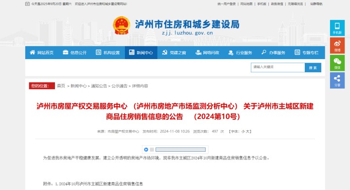 为促进房地产平稳健康发展,建立公开透明的房地产市场环境,2024年11月8日,泸州市房屋产权交易服务中心(泸州市房地产市场监测分析中心)发布了关于泸州市主城区新建商品住房销售信息的公告(2024第10号)。