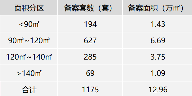 根据公告显示,2024年10月泸州市主城区新建商品住房备案套数合计为1175套,备案面积合计为12.96万㎡。其中,小于90㎡的户型备案194套,面积1.43万㎡;90㎡-120㎡的户型备案627套,面积6.69万㎡;120㎡-140㎡的户型备案285套,面积3.75万㎡;大于140㎡的户型备案69套,面积1.09万㎡。