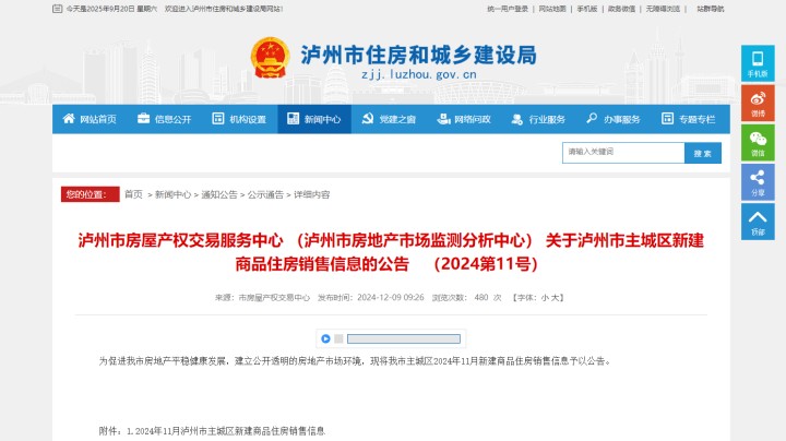为促进房地产平稳健康发展,建立公开透明的房地产市场环境,2024年12月9日,泸州市房屋产权交易服务中心(泸州市房地产市场监测分析中心)发布了关于泸州市主城区新建商品住房销售信息的公告(2024第11号)。
