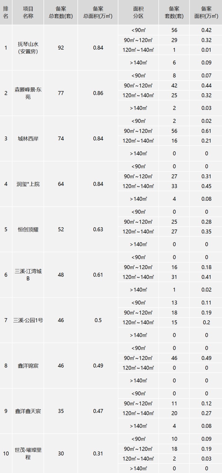 同时,公告还列出了2024年11月泸州市主城区新建商品住房销售前10的项目,前3名分别是抚琴山水、森滕峰景东苑和城林西岸。来看看哪10个楼盘卖的好。