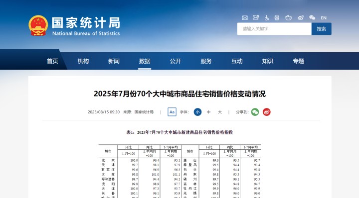 附:《国家统计局城市司首席统计师王中华解读2025年7月份商品住宅销售价格变动情况统计数据》