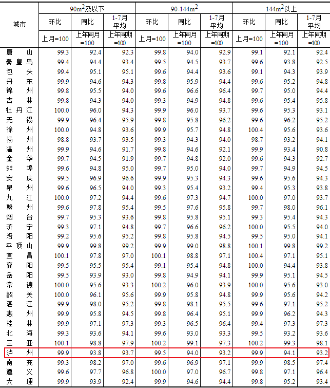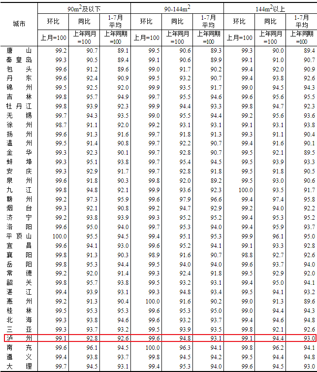 根据发布的数据显示,7月泸州新建商品房价格环比下降0.4%,同比下降6%。从面积区间来看,90㎡以下环比下降0.1%,同比下降6.2%;90-144㎡环比下降0.5%,同比下降6%;144㎡以上环比下降0.1%,同比下降5.9%。