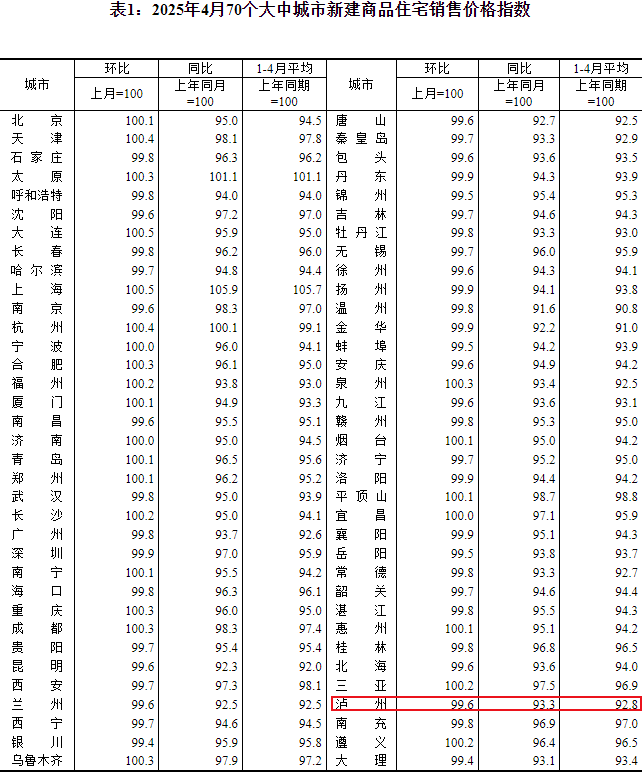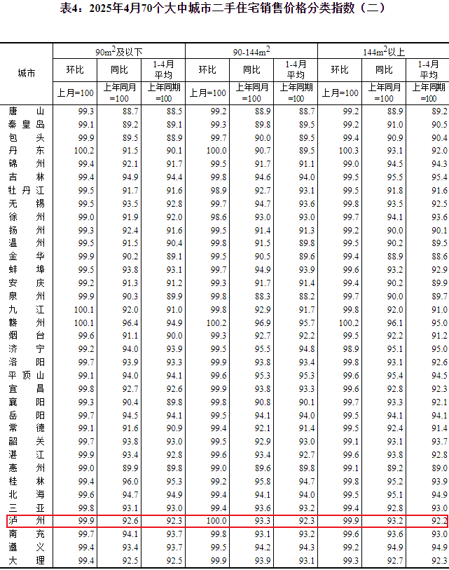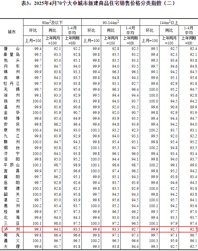 2025年5月19日,国家统计局发布了2025年4月份70个大中城市商品住宅销售价格变动情况。来看看泸州房价有什么变化吧!