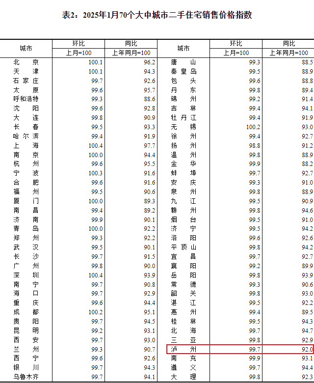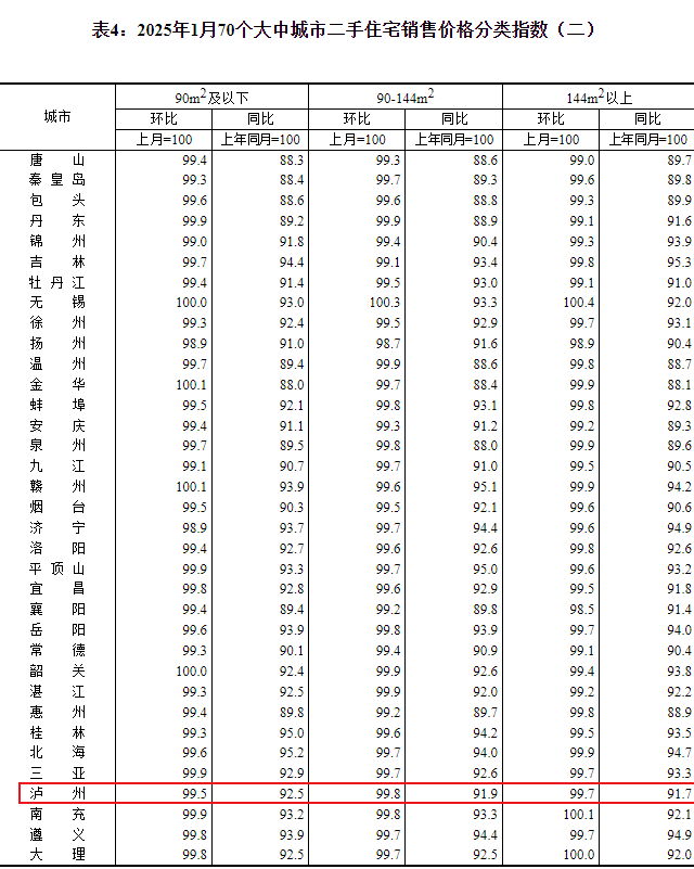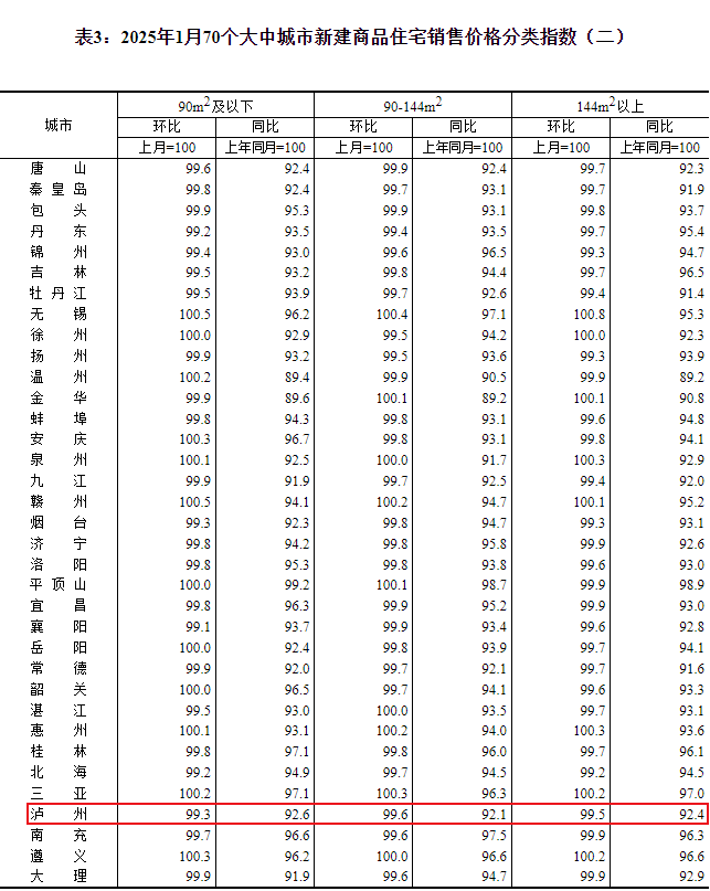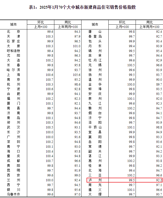 2025年2月19日,国家统计局发布了2025年1月份70个大中城市商品住宅销售价格变动情况。来看看泸州房价有什么变化吧!