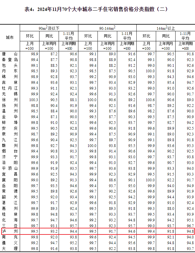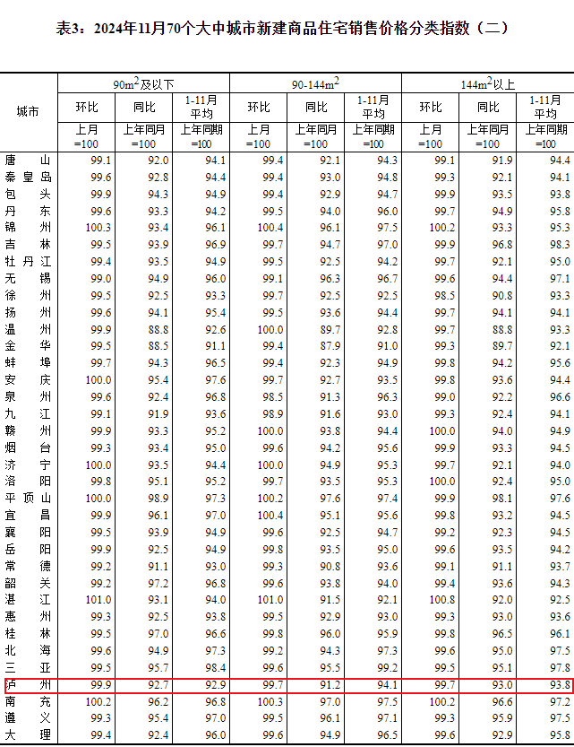 2024年12月16日,国家统计局发布了2024年11月份70个大中城市商品住宅销售价格变动情况。来看看泸州房价有什么变化吧!