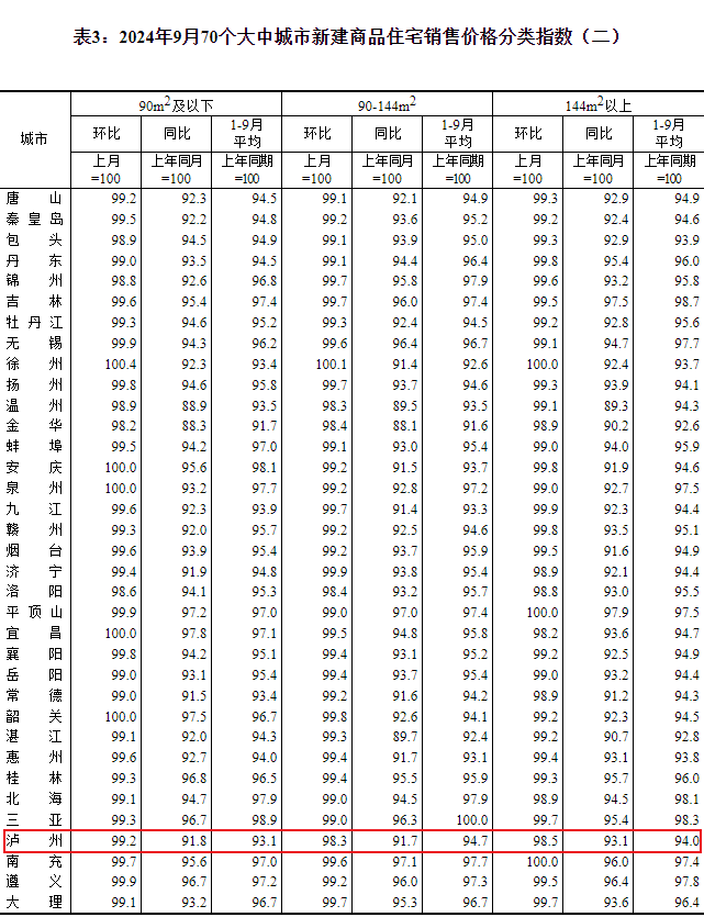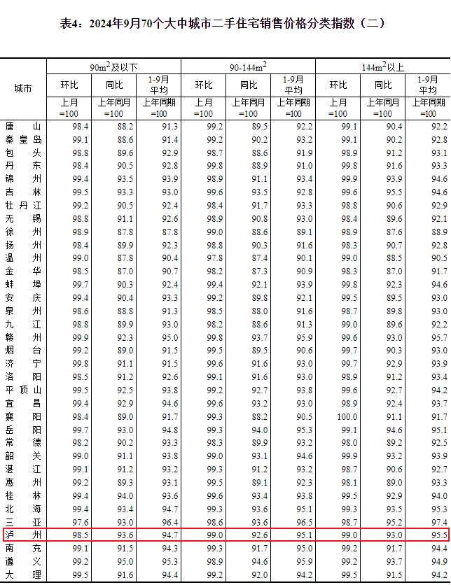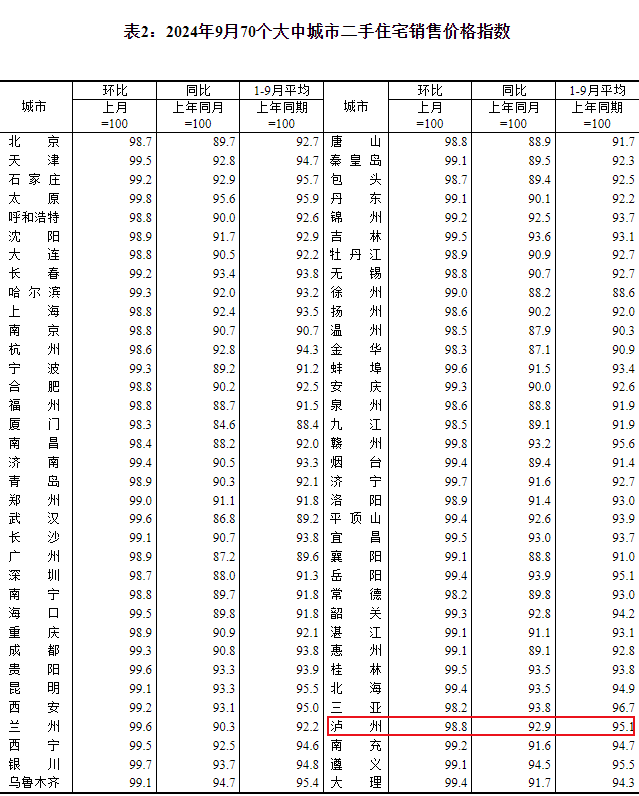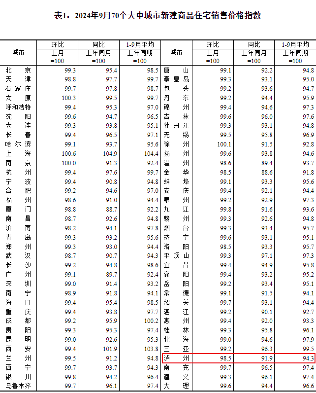2024年10月18日,国家统计局发布了2024年9月份70个大中城市商品住宅销售价格变动情况。来看看泸州房价有什么变化吧!