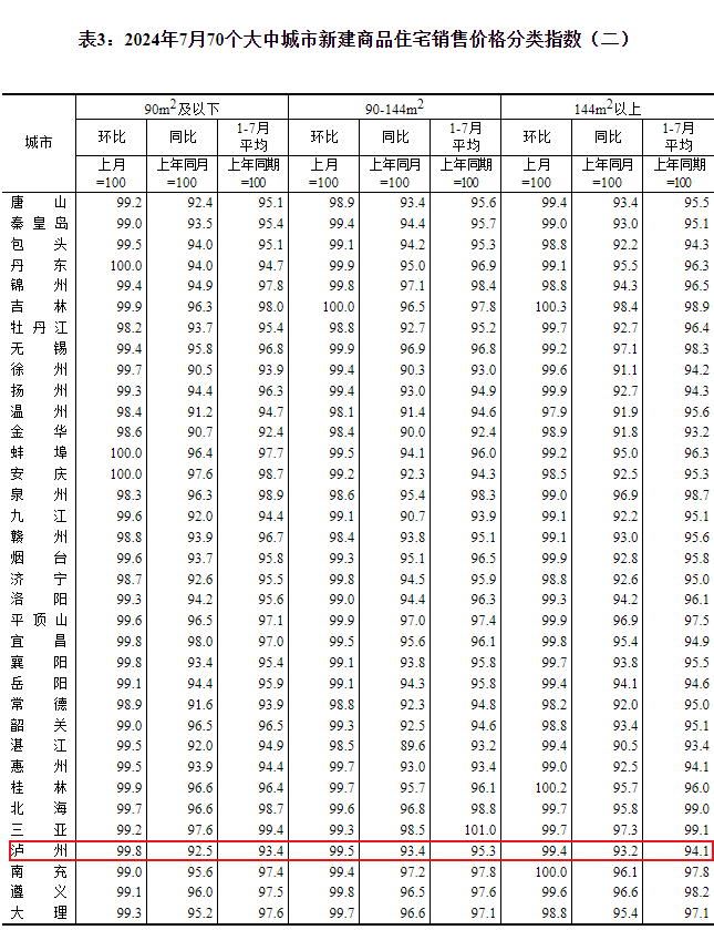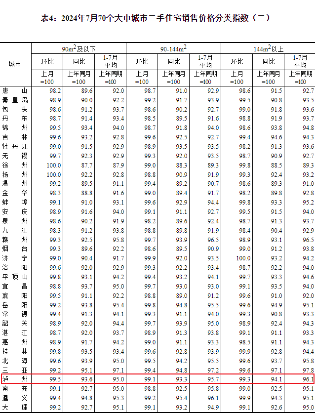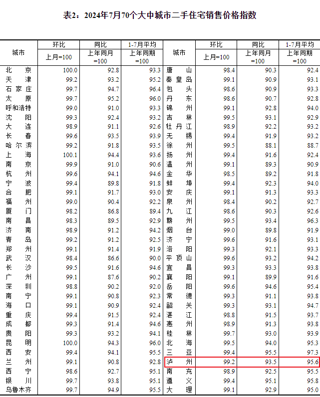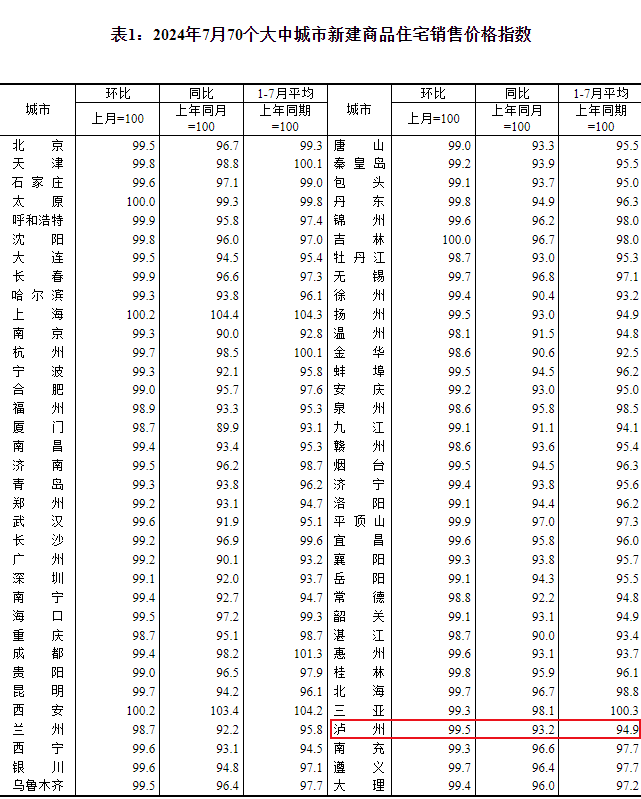 2024年8月15日,国家统计局发布了2024年7月份70个大中城市商品住宅销售价格变动情况。来看看泸州房价有什么变化吧!